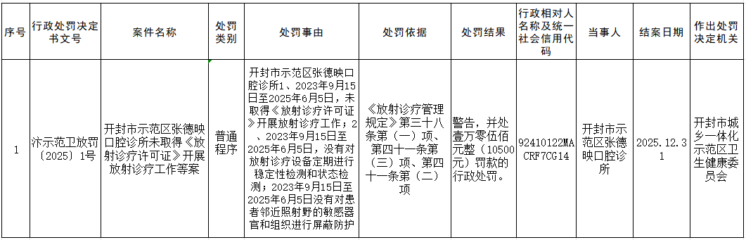 开封市城乡一体化示范区卫生健康委员会卫生行政处罚信息公示