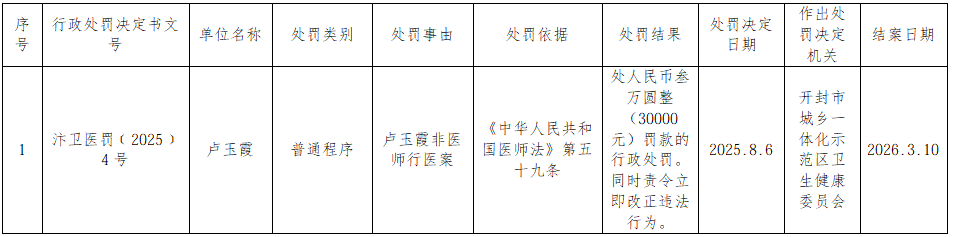 开封市城乡一体化示范区卫生健康委员会卫生行政处罚公示