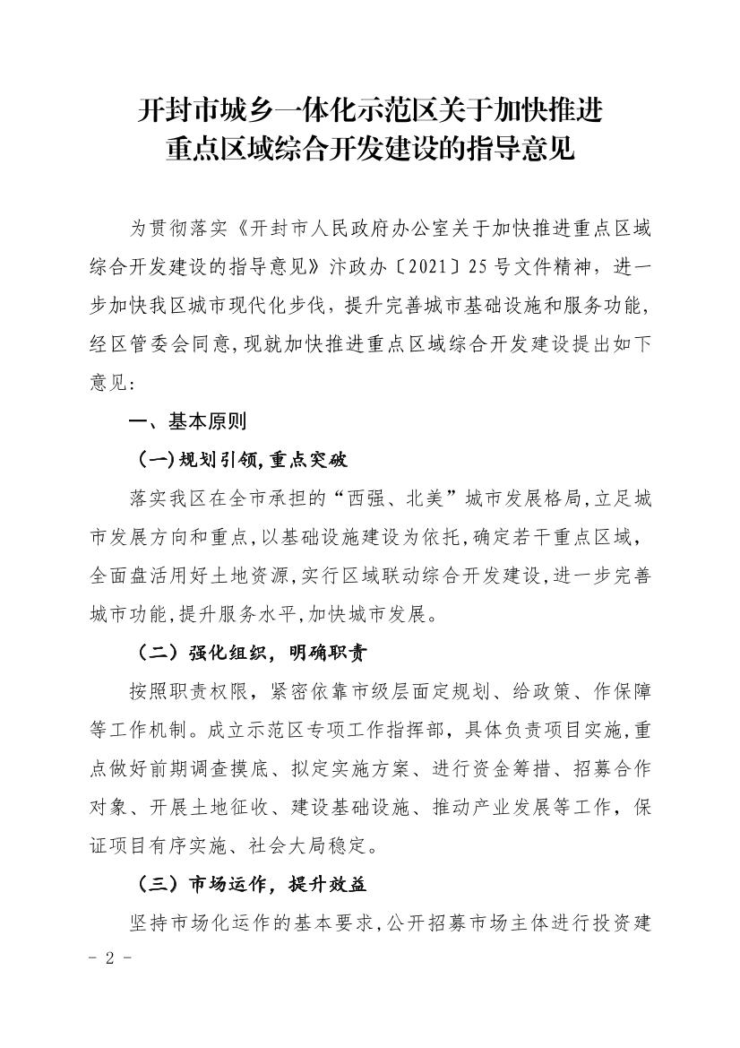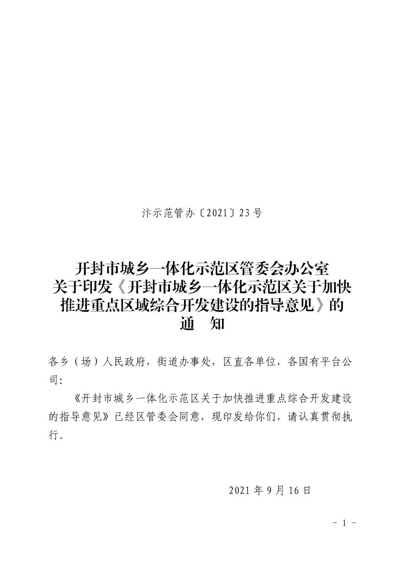 开封市城乡一体化示范区管委会办公室 关于印发《开封市城乡一体化示范区关于加快推进重点区域综合开发建设的指导意见》的通知