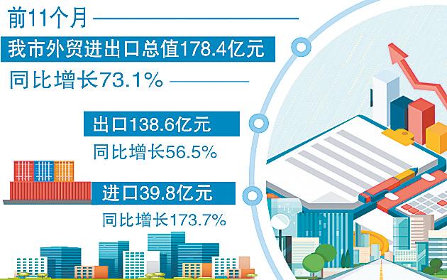 各类经营主体进出口额均实现增长,其中民营企业仍是“主力军”。前11个月,我市民营企业进出口总值174.3亿元,同比增长76.4%;外商投资企业进出口总值2.8亿元;国有企业进出口总值1.3亿元。