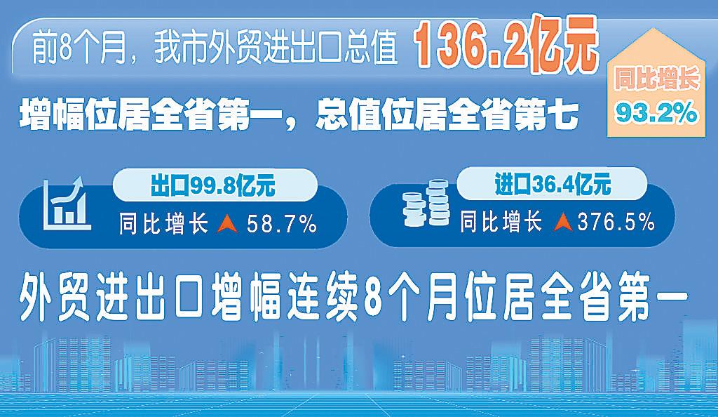 记者9月21日从开封海关获悉,前8个月,我市外贸进出口总值136.2亿元,同比增长93.2%,增幅位居全省第一,总值位居全省第七。其中,出口99.8亿元,同比增长58.7%;进口36.4亿元,同比增长376.5%。我市外贸进出口增幅连续8个月位居全省第一。